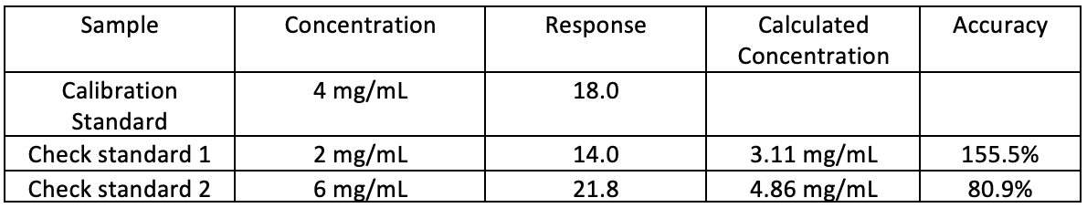 The new method however requires us to run two check standards, one at a higher concentration and one at a lower concentration as the new samples are expected to be at a high and a low level. The QC lab prepares a sample at a concentration of 6mg/mL and we run that on our system and get the following results: